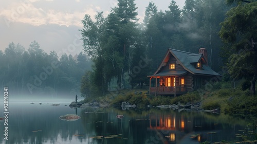 Fototapeta premium Tranquil Lakeside Retreat for Your Getaway, Foggy day