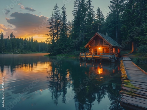 © panu101, Fototapeta premium Tranquil Lakeside Retreat,Lush Forest Reflected in Still Waters