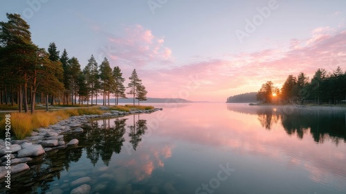 © Babil, Fototapeta premium Tranquil Lakeside Scene At Dusk Featuring Pastel Sky Reflection Of Trees And Gentle Water