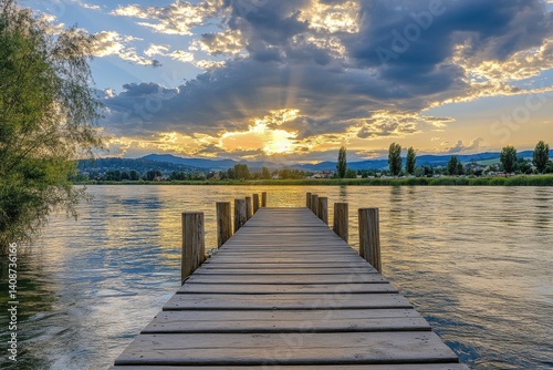 © Pokki, Fototapeta premium Tranquil Lakeside View A Wooden Pier Reaching Out to the Sunset's Glow