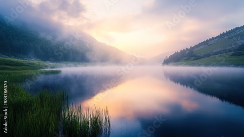 © Nathan, Fototapeta premium Tranquil landscape featuring a serene lake at dawn, surrounded by misty mountains and lush greenery.