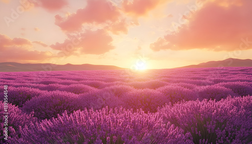 Obraz premium Tranquil landscape featuring a serene sunset above lavender fields