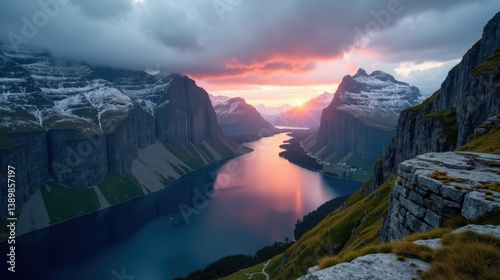 © Collse, Obraz premium Tranquil landscape in Norway, Europe during dawn, with cloudy weather, captured from a view from above perspective.