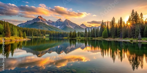 © Atittaya, Fototapeta premium Tranquil landscape with mountains, forest, and lake during golden hour