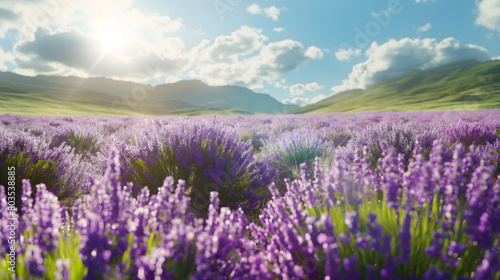 Naklejka premium Tranquil Lavender Field with Sunlight and Mountain Backdrop