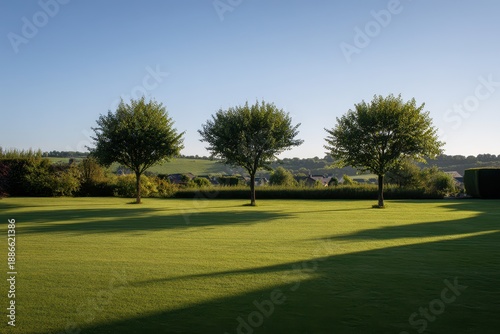 Fototapeta premium Tranquil lawn landscape featuring three trees under a clear blue sky