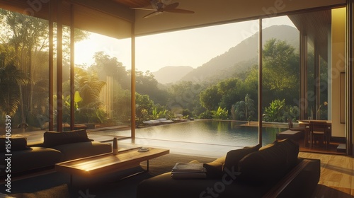 © khuraikah, Fototapeta premium Tranquil living room with a view of a pool and lush landscape.