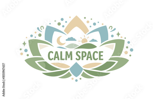 © 4zevar, Fototapeta premium Tranquil lotus emblem with sunrise and crescent moon design elements