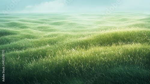 Fototapeta premium Tranquil lush green rolling grass fields under soft misty sky with gentle...