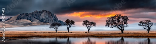 © Sirapopmillion, Fototapeta premium Tranquil Majestic Landscape with Dramatic Sky and Reflective Water at Dusk