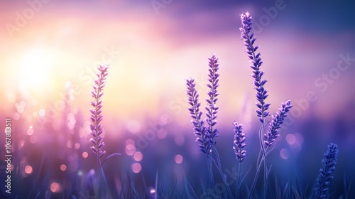 © Ndoomyim, Naklejka premium Tranquil meadow, lavender flowers in soft light creating a picturesque and serene landscape