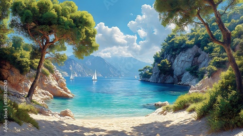 © GenZ_Pro, Fototapeta premium Tranquil Mediterranean tropical beach pristine waters shimmering under the midday sun soft sandy shoreline lined with vibrant greenery and dramatic cliffs with sailboats in the distance