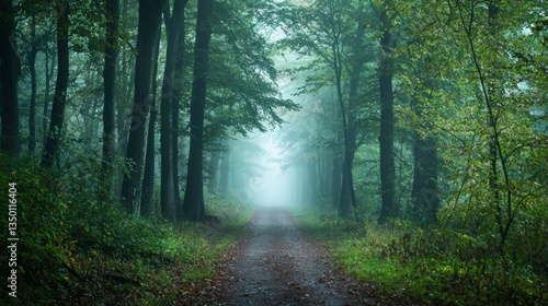 © Tuachan, Fototapeta premium Tranquil Misty Forest Pathway Surrounded by Lush Green Trees