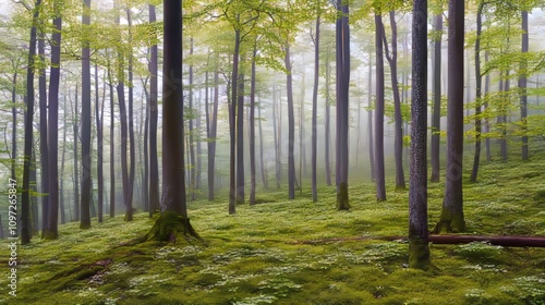 © SAIFUL, Fototapeta premium Tranquil Misty Forest with Tall Green Trees and Moss
