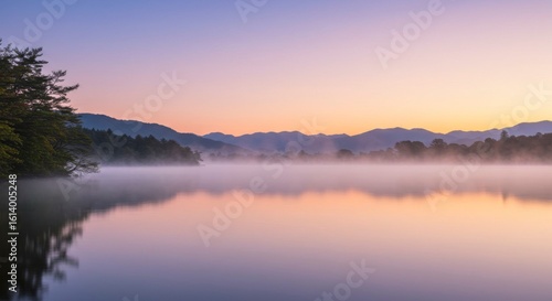© Rex, Fototapeta premium Tranquil misty lake scene at dawn, with mountains in the background and trees. Soft light over water