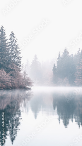 Obraz premium Tranquil misty lake with reflections and trees in serene landscape