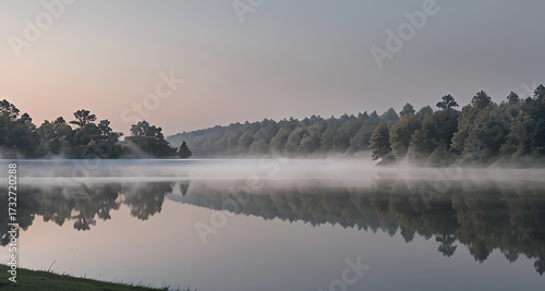 Fototapeta premium Tranquil Misty Morning on a Lake with Perfect Reflection