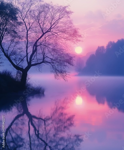 Fototapeta premium Tranquil Misty Morning: Serene Reflection of Silhouette Trees at Dawn Over...