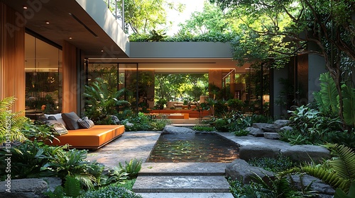 Fototapeta premium Tranquil Modern Courtyard Oasis Lush Tropical Garden Design with Water...