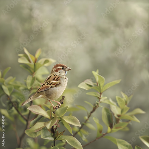 Fototapeta premium Tranquil Moment: A Sparrow Blending Harmoniously with Nature on a Delicate...