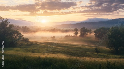 Obraz premium Tranquil Monday Morning: Misty Sunrise Over Calm Countryside