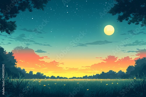 Fototapeta premium Tranquil Moonlight Landscape - Serene Night Sky and Vibrant Starry Dusk Illustration