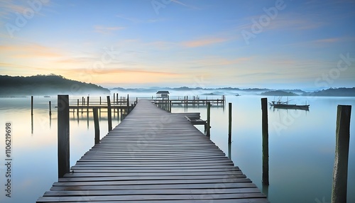 Fototapeta premium Tranquil morning, dreamy scene of wooden dock by the harbor.