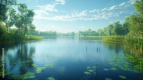 Fototapeta premium Tranquil morning light reflects on a serene lake surrounded by lush greenery and calm waters in a peaceful natural setting