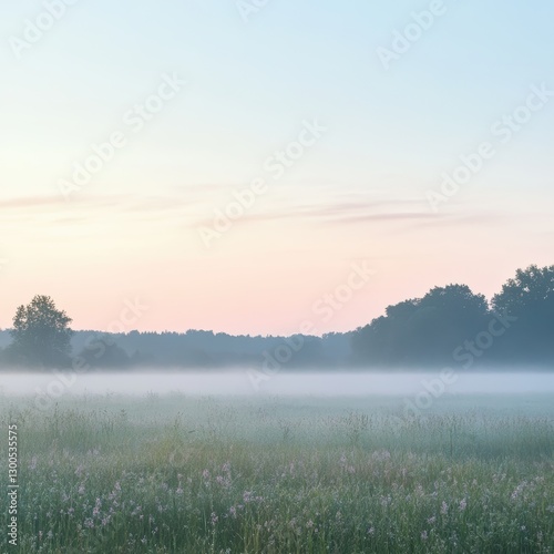 Fototapeta premium Tranquil Morning Mist Over Rolling Fields and Distant Trees