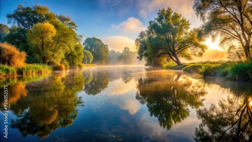 © Collection, Fototapeta premium Tranquil morning scene by the river with misty water and reflections