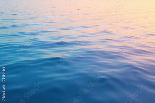 © Sanook, Naklejka premium Tranquil Morning Surf A calm, glassy ocean surface reflecting a soft, misty morning sky. Gentle ripples indicate incoming waves. Pastel colors and a serene atmosphere. No people or human elements
