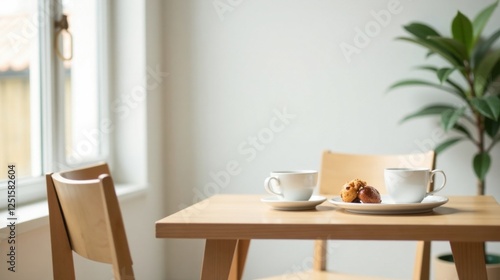 Fototapeta premium Tranquil morning tea break with delicate pastries at a simple wooden table near a bright window