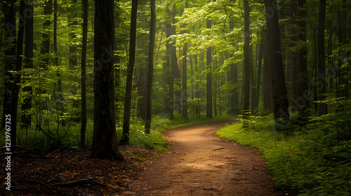 © Lily, Obraz premium Tranquil Morning Walk Through a Serene Forest Pathway