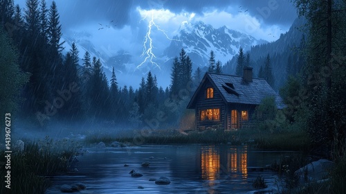 © iam, Fototapeta premium Tranquil mountain cabin by a serene lake at night.