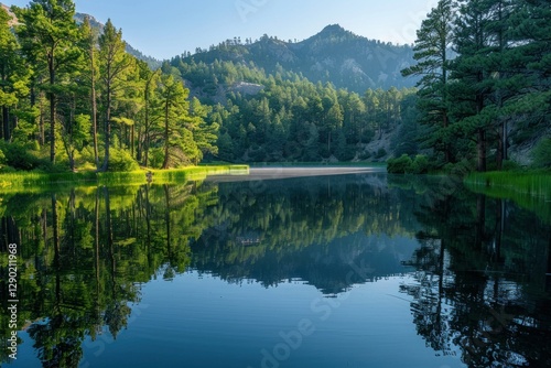 © Fitriaa, Fototapeta premium Tranquil Mountain Lake Reflection