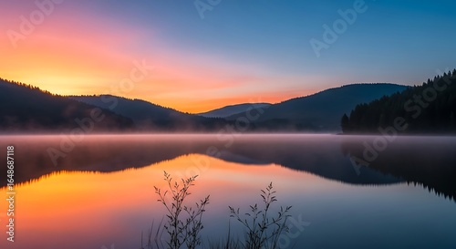 © Agata, Fototapeta premium Tranquil mountain lake reflects a vibrant sky during a foggy sunrise serene landscape