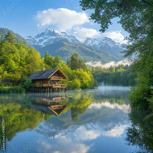 © op, Fototapeta premium Tranquil Mountain Lake with Cabin and Reflection Under Blue Sky