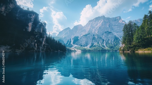 © Nike, Fototapeta premium Tranquil Mountain Lake with Dramatic Peaks and a Bright Blue Sky