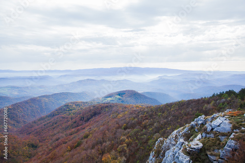 © mitarart, Naklejka premium Tranquil mountain landscape with panoramic sky and forest, peaceful nature scene.