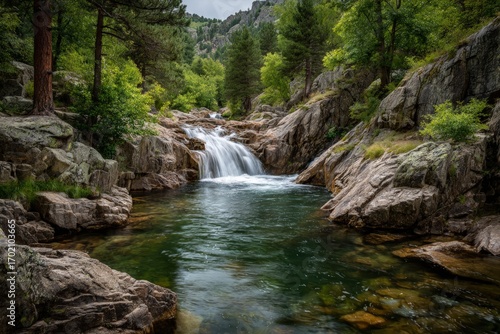 Obraz premium Tranquil mountain scene with cascading waterfall, lush green foliage, and natural rock formations