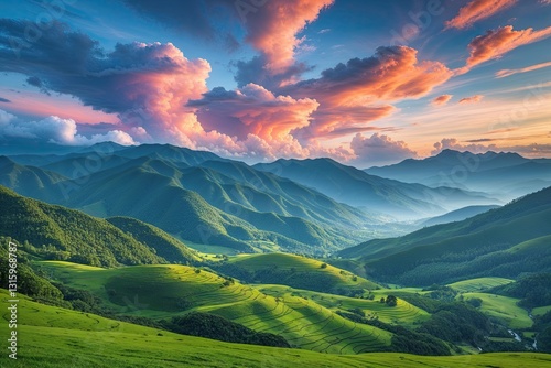© Michael, Obraz premium Tranquil Mountain View with Lush Green Hills and Colorful Clouds in Serene Landscape