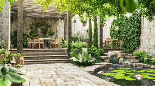© Jakkarin, Obraz premium Tranquil Multi-Level Garden Cafe with Wooden Seating and Greenery