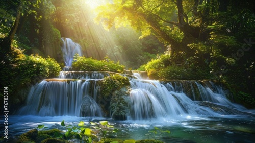 Obraz premium Tranquil mystical forest with cascading waterfalls, fairy tale magic and...