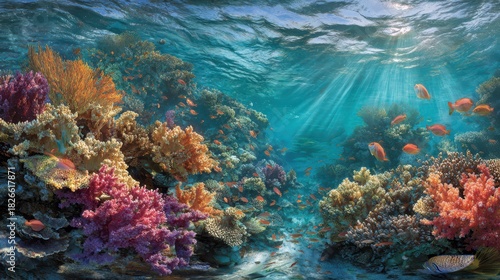 Fototapeta premium Tranquil Ocean Reef Landscape: Brilliant Corals, Tiny Fish, and Dappled Sunlight