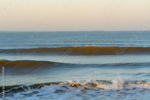© bevisphoto, Fototapeta premium Tranquil ocean scene featuring evenly breaking waves under the gentle glow of early morning light.