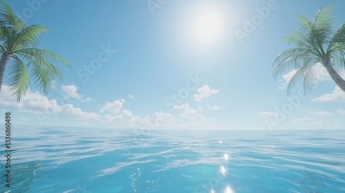 © Esmeralda, Fototapeta premium Tranquil Ocean Scene with Palm Trees Under Sunny Sky
