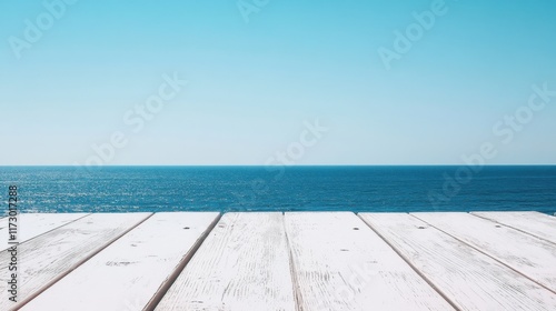 © 69, Fototapeta premium Tranquil Ocean View from Wooden Deck Under Clear Blue Sky