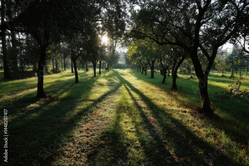 Naklejka premium Tranquil orchard scene showing sunrise through rows of trees creating shadows...