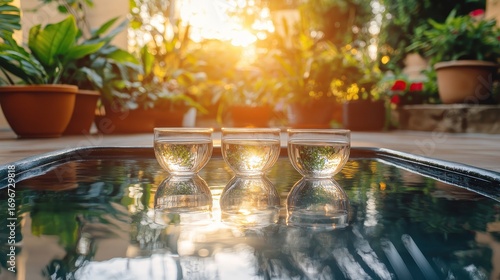 © NashEmpire, Fototapeta premium Tranquil Outdoor Scene with Glass Cups and Reflections in Water