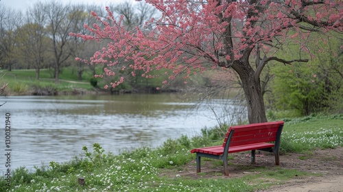 Obraz premium Tranquil park view with lush pink cherry blossoms and a solitary red bench...